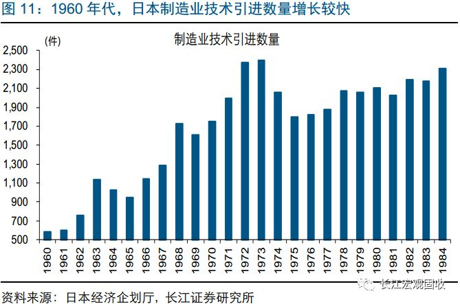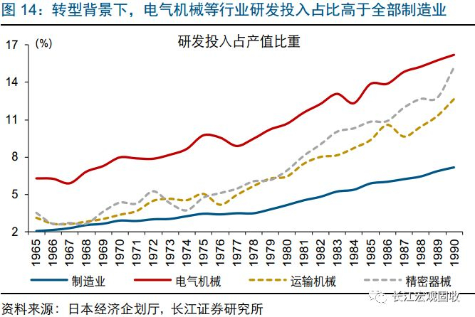 转型期间,日本继续引进海外技术的同时,加大国内研发投入,支持引导电气机械等技术密集型产业加快培育。转型以来,日本研发投入占GDP比重持续抬升,自1970年的1.3%持续提升至1988年的2.6%;其中,电气机械、精密器械等技术密集型产业研发投入占比明显高于全部制造业水平,为日本技术密集型产业的快速扩张积累了较为丰富的技术优势,进一步带动主导产业由资本密集型向技术密集型升级。研发投入持续提升背景下,电气机械等部分行业继续加快引入外部先进技术,实现新兴领域赶超式发展。