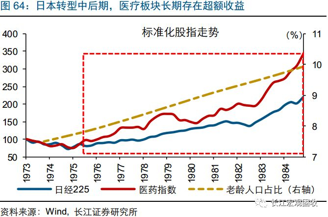 日本转型中后期,电器、医药为消费升级的典型代表,长期跑赢市场;食品消费板块与日经225指数走势基本一致,整体稳健增长。转型中后期,日本人均收入快速增长,消费占GDP比重也随之提升。中高端电器,是消费升级的典型代表,占社会销售零售总额比重明显提升,对应股指持续跑赢市场。转型以来,日本老龄人口占比趋于抬升,带动医药消费增长,医药股指相对于日经225指数快速上涨,长期获得超额收益。食品行业为大众消费板块,弹性相对较小,与大盘走势基本一致,并不存在明显的超额收益。