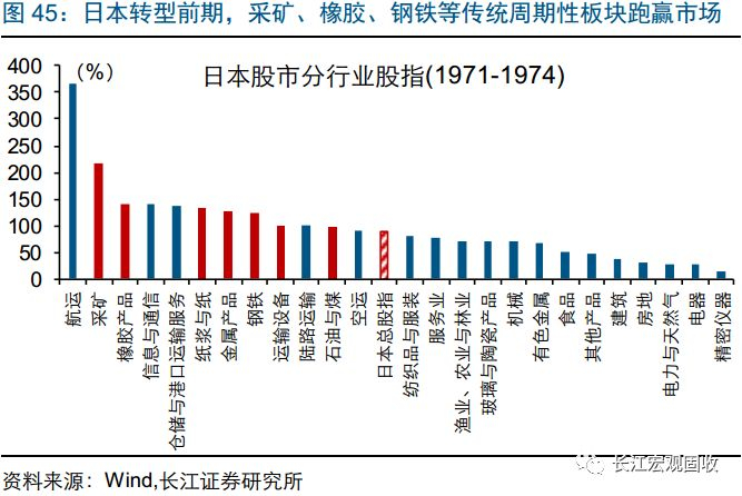 日本转型中后期,传统板块股指表现分化:钢铁、机械等行业进入实质收缩阶段、股指表现持续低迷;有色金属、石油和煤制品行业,股指跑赢大盘。转型中后期,日本产业结构加速转型升级,传统钢铁和机械等过剩产能行业加速去化,进入实质性收缩阶段,对应股市板块表现也较为低迷。有色金属行业,一方面受益于技改升级提升生产效率,另一方面得益于电子电器等新兴产业的有力拉动,表现持续好于市场。