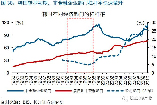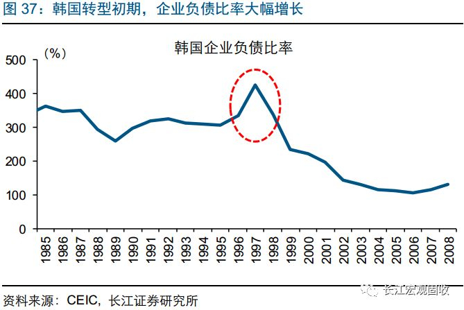 韩国转型初期面临增速换挡,主要通过加快金融自由化、鼓励企业海外借贷加杠杆,以刺激投资和经济增长。1990年代,韩国经济增速中枢下移,进入增速换挡的转型阶段。然而,韩国政府并未意识到经济增速回落的客观规律,而是继续鼓励企业扩大负债和投资,并放宽企业从国外借款的要求,导致外债规模快速增长。这一阶段,企业杠杆大幅攀升,1997年非金融企业部门杠杆高达110%,接近历史最高点,企业平均负债比率超过400%。这一阶段,政府财政支出保持较高增速,货币供应增速和利率水平整体平稳。