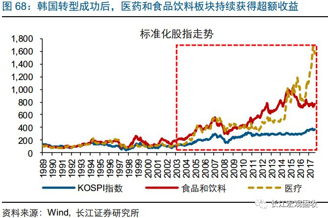韩国医疗和食品饮料等消费升级板块,转型期间收获超额收益,在转型成功后仍有亮眼表现。1993-2003年韩国转型期间,食品饮料板块指数累计上涨66%,医疗板块指数上涨11%,远超过KOSPI指数-6%的变化幅度,跑赢大盘。从相对收益来看,食品饮料和医疗板块,长期存在超额收益,仅在亚洲金融危机期间跑输市场。2003年韩国转型结束后,食品饮料和医药板块,相对大盘仍存在长期的超额收益。