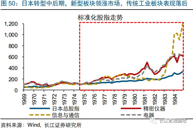 日、韩转型期间,政策重点支持、竞争力提升的战略性新兴产业,存在长期超额收益。转型期间,市场表现在一定程度上反映产业结构的调整方向。日本转型中后期,信息与通信、精密仪器指数领涨市场。韩国转型期间,电子设备、化学品领涨,电子的中上游金属制品板块也存超额收益,转型成功后表现仍好。