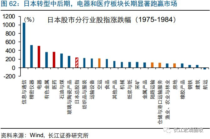 转型期间,两类板块明显跑赢大盘:第一类是政策支持下快速发展的战略性新兴产业,如日本的精密仪器、韩国的电子和电气设备;第二类是电器和医药等消费升级相关板块。
