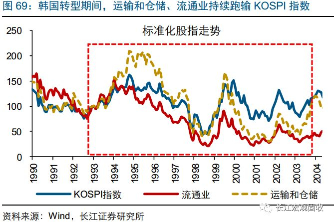 与日本相似,韩国转型期间,运输仓储传统服务业、金融机构板块总体跑输大盘。1990年代前期,伴随经济整体修复,运输仓储作为生产支持性行业,基本面也出现修复,对应板块股指表现不差。这一阶段,韩国通过金融机构大量借入外债,金融机构从中受益,对应股指板块也存在客观的超额收益。1990年代后期,韩国经济增长压力加大,经济较为动荡,生产整体低迷,作为生产支持性行业的运输仓储服务业也面临下滑,对应股指表现较为疲弱;亚洲金融危机期间金融体系大幅整顿、利率水平大幅趋降,金融服务板块股指总体跑输市场。与日本相似,转型结束后,韩国金融、运输等板块表现也较为平淡,超额收益不复存在。
