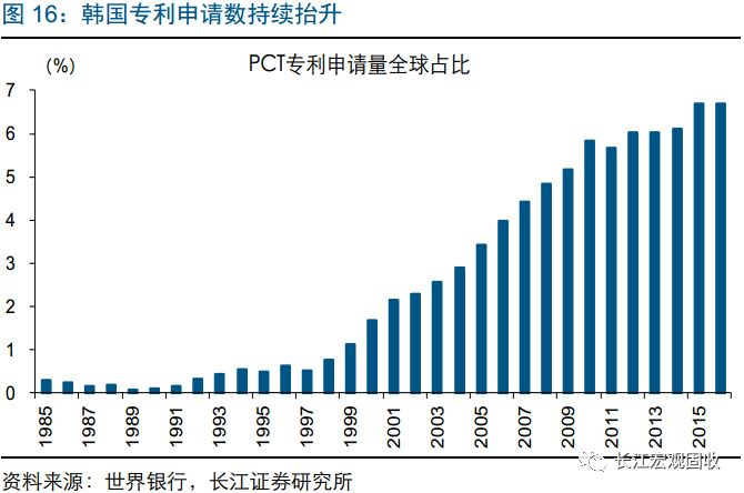 引进、吸收海外先进技术,是日、韩追赶阶段技术进步、产业结构升级的重要动力。二战结束后,日本为了迅速提升技术水平,制定“吸收性”技术发展战略,大力引进国外先进技术,用较低的成本实现技术追赶 。1950-1975年,日本共引进25777 项外国技术,几乎掌握了全世界半个世纪以来发明的全部技术。更为重要的是,日本引进海外技术后,极为重视对技术的吸收、消化,并在此基础上进一步创新。追赶阶段,韩国引入的海外技术数量也快速增长,主要是来自美国和日本等产业转出国,并主要集中在机械(27.8%)、电子电气(20.5%)、石油化工(16.3%)等板块领域。