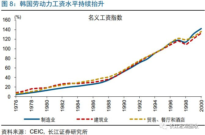 1990年代初期,韩国也面临人口结构变化、劳动力成本上升等传统要素红利减弱的困境,进而开启经济转型之路。1960年代至1980年代末期的追赶阶段,韩国15-64岁劳动人口占比从55%以下提升至70%左右,为韩国劳动密集型产业的快速发展提供了充足的低成本劳动力资源,人口红利优势显著。追赶阶段,韩国劳动力工资水平持续抬升,由于劳动力供给相对充分,成本端压力并未充分显现,对韩国制造业竞争优势的影响相对有限。1990年代初期,韩国劳动力人口占比增长趋缓,基本保持在70%的水平,劳动力工资加速上涨、侵蚀企业利润,人口红利逐渐消失,制造业竞争优势趋弱。