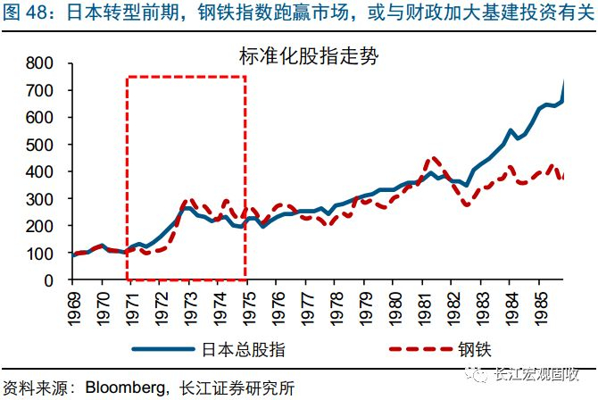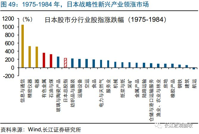 日本转型前期,采矿、钢铁、纸制品等传统周期性工业板块领涨市场,而代表产业升级方向的战略性新兴产业尚未发力。1971-1974年,日本转型前期,涨幅居前、跑赢市场的制造业板块分别为采矿业(217%)、橡胶制品(142%)、信息与通信(142%)、纸浆与纸制品(132%)、金属产品(128%)、钢铁(123%)、运输设备(102%)等,以传统周期性板块居多,其中,采矿业较大盘的优势较为显著 。钢铁板块,或受益于这一阶段日本财政扩张、加大基建投资的支持。这一阶段,除信息与通信板块或受益于1971年政策支持而跑赢大盘之外,代表性战略新兴产业板块尚未发力。