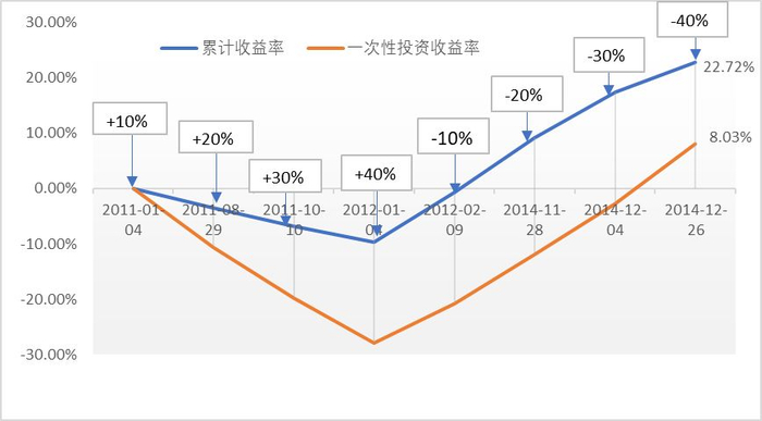 2011年1月4日开始加仓,PE值为15.80,历史分位为30.7%,在市场处于震荡状态下,把加仓跌幅设为-10%左右,是适中的。