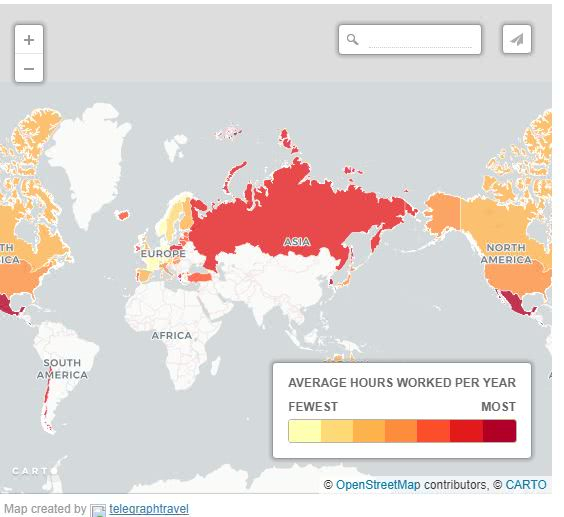 截图来自于英国电讯报,颜色从左到右表示工作时间从短到长