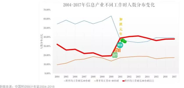 为什么是2011?从统计数据可以看出,2011年是微信、美团、爱奇艺等相继成立,小米发布了它的第一款智能手机,这一年被业内定义为中国移动互联网元年,当然也可以算是“大面积加班元年”。