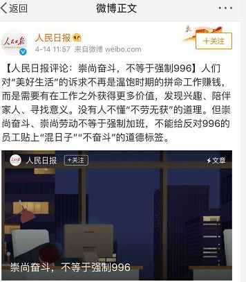 当然,也有不赞成996的。在马云,刘强东等谈论996的必要性的时候,人民日报给予了有力的回击,倡导人民需要在工作之余获得更多价值、发现兴趣、陪伴家人、寻找意义。