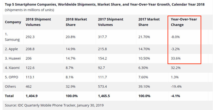 2018年全球手机出货量前五名(IDC数据)