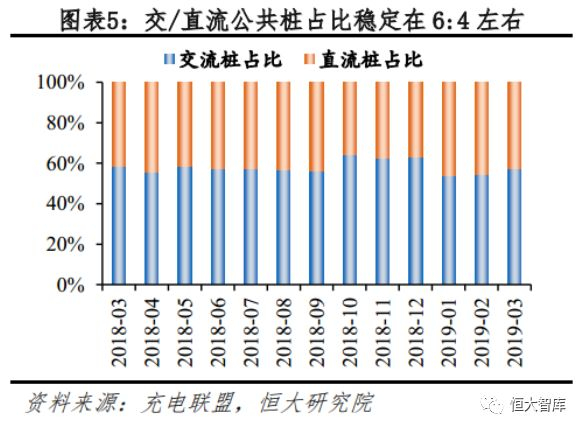 交流、直流公共桩占比稳定在6:4左右。2019年3月交流公共桩占比57.2%,直流公共桩占比42.8%。