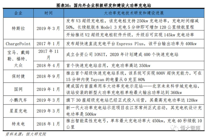 整车企业和充电运营商巨头积极布局大功率充电技术,我国大功率充电国家标准制定工作即将启动。从海外来看,特斯拉和美国充电桩运营巨头ChargePoint均已发布大功率充电技术,宝马、戴姆勒、福特、大众成立的合资公司IONIT的首个350kw充电站已于2018年4月启用。从国内来看,包括国网、星星充电和特来电在内的充电桩巨头和小鹏汽车等新造车势力正在发力大功率充电技术,其中小鹏汽车120kw充电桩已投入运营。目前中国电力工业联合会标准化管理中心已在北京、南京、常州等地投建大功率充电桩示范项目,为国标制定提供试验数据,预计2019年6月底前将启动大功率充电国标制定工作。