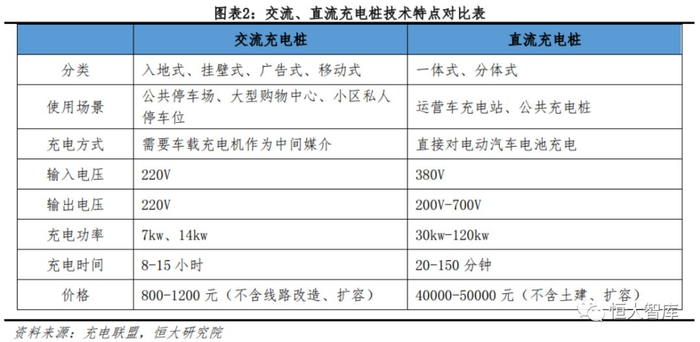 充电桩是为电动汽车提供交/直流电的充电装置。交流桩通过车载充电机充电,输出功率一般为7kw,单桩制造成本仅为800-1200元,但充电时长8-15小时;直流桩直接为电池充电,功率在60kw以上,满电状态仅需20-150分钟,但单桩制造成本约5万元,且会对电池造成损伤。