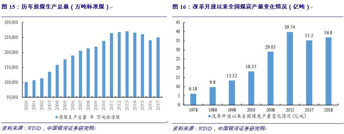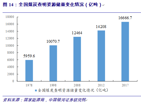 全国煤炭查明资源储量从1978年的5960亿吨增加到2017年的1.67万亿吨。累计新增煤炭生产能力44.4亿吨/年,建成了年产120万吨及以上的大型煤矿1200余处,产量比重提高到80%以上(其中,千万吨级煤矿42处,产能6.73亿吨/年;在建和改扩建千万吨级煤矿37处,产能4.71亿吨/年);全国煤炭产量由1978年的6.2亿吨增加到2000年的13.84亿吨、2018年的36.8亿吨,累计生产煤炭773亿吨。