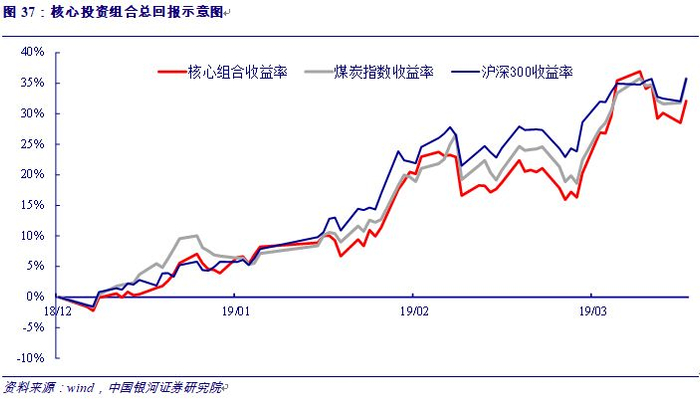 申万煤炭行业指数2019年初至今(2019.4.16)累计收益率35.77%。2019年初至4月16日,银河煤炭核心组合累计收益率32.1%。在累计方面,核心组合跑输行业指数3.67个百分点,核心组合跑输沪深300指数3.61个百分点。因为我们核心组合的股票以优质龙头白马股为主,白马股年初至今的涨幅落后于行业指数,未来存在很大的补涨空间。