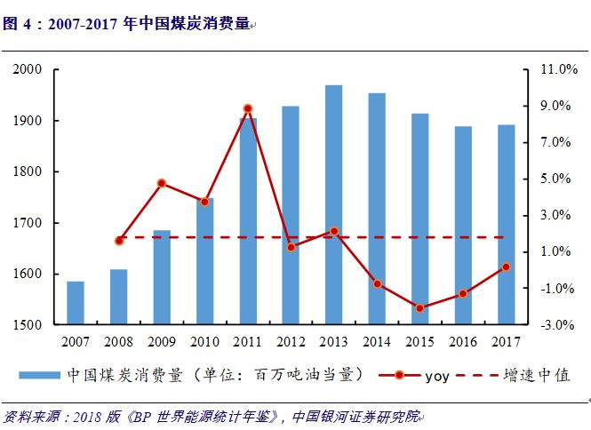 2007年至今,中国煤炭消费量经历了快速增长然后逐步下降,近两年又略有增长的过程。2007至2013年,中国煤炭消费量快速增长,2013到2016年开启了下降之路,2017年重回微幅增长势头,在连续三年下降之后出现反弹。