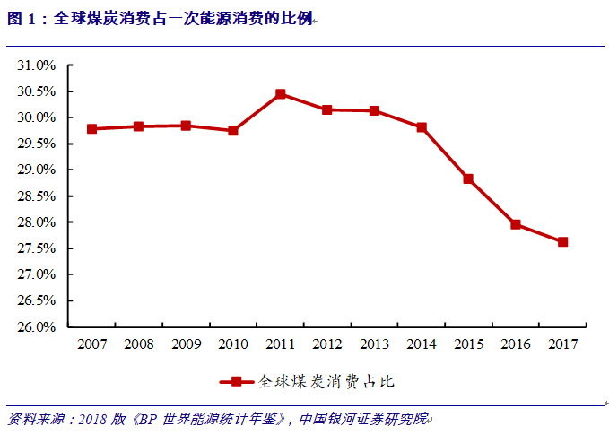 全球能源结构调整效果显著。根据BP的数据,2017年全球一次能源消费强劲增长,主要由天然气和可再生能源引领,煤炭在能源结构中的占比持续下降。2017年全球来看,煤炭在一次能源中占比下降至27.6%,为2004年以来的最低水平。全球能源结构调整效果显著。
