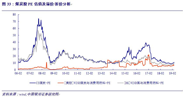 我们比较了A股、美股、港股煤炭板块2006年至今的历史TTM市盈率,截止到2019年4月16日,当前A股煤炭板块市盈率为10.9X,美股为6.2X,港股为8.1X。A股、美股、港股煤炭板块PE的历史均值(2006至2019年)分别为19.9X、4.9X、15.9X,当前美股PE与历史均值溢价26.7%,A股煤炭股PE较历史均值折价45%,港股煤炭PE较历史均值折价为48%,我们认为A股和港股从PE相对估值角度处于历史低位,具有较大的估值修复空间。