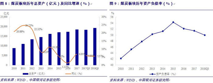 煤炭行业总资产规模于2018年三季度达19,262.95亿元,同比增长5.57%,2012年之前,总资产年均增长率均高于20%,处于快速扩张阶段,近几年呈稳定上涨态势,同比增速稳定在5%左右。截至2018年9月,行业资产负债率为49.97%,延续了2015年以来的下降趋势,煤炭企业降杠杆效果显著。政策引导下,煤炭企业尝试债转股等市场化手段积极降低债务率,债务负担解决、企业经营状况逐步好转、产业结构优化升级有益于煤企进一步发展。