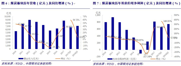 2018年三季度煤炭行业营业收入达7,096.81亿元,同比上涨6.39%,增速在2017年见顶后回落至个位数。扣除非经常损益的归母净利润为743.17亿元,利润增速走势与营业收入一致,同比增长12.97%,较2017年三季度增速近370%大幅回落,但保持稳定增长。一方面受价格影响,煤炭价格从2011年起持续下跌,直至2015年随国际原油价格开启了新一轮上升期,煤价维持高,利润随之增长;另一方面煤炭在我国能源结构中的主导地位长期不会改变,在供给侧改革、行业整合之后,煤炭企业的盈利情况较为乐观。