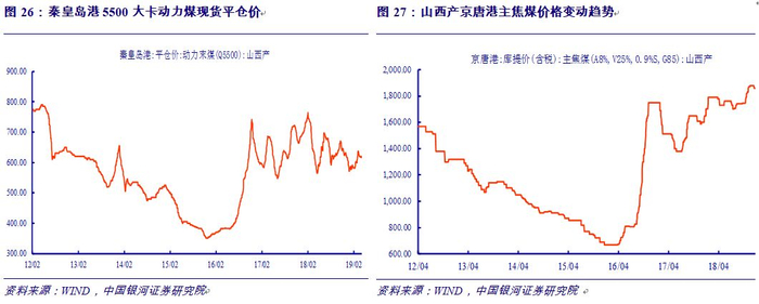 2018年末,重点煤企存煤5500万吨,同比减少609万吨,下降10%,处于较低水平;全国统调电厂存煤1.31亿吨,同比增加2395万吨,增幅22.4%,可用天数21天,存煤由产地向终端用户转移。