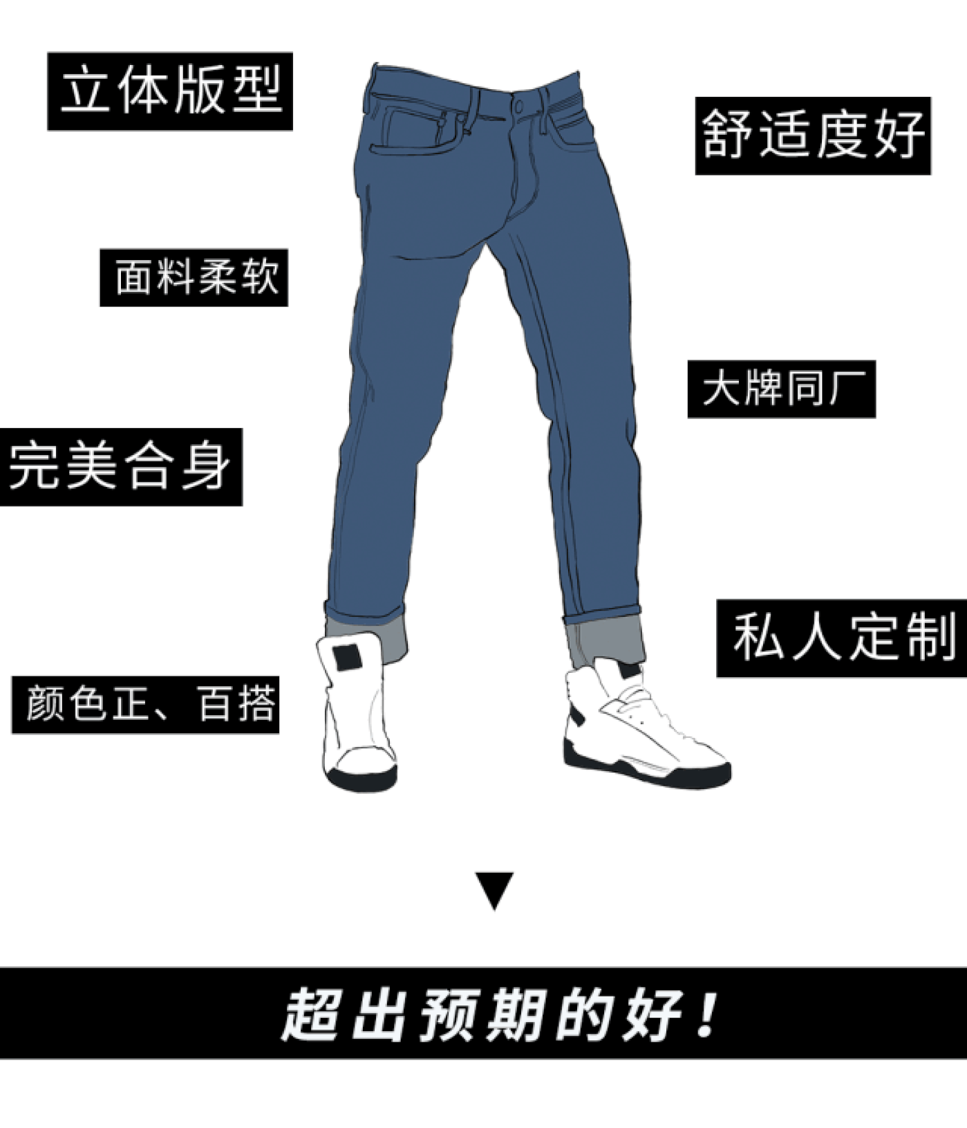 简单一条牛仔裤,就可以颠覆你对定制的认知,让你得到一条“最合身”的牛仔裤。而且定制过程完全不需要腿长、臀围、横裆、立裆等等数据,就是那么神奇!