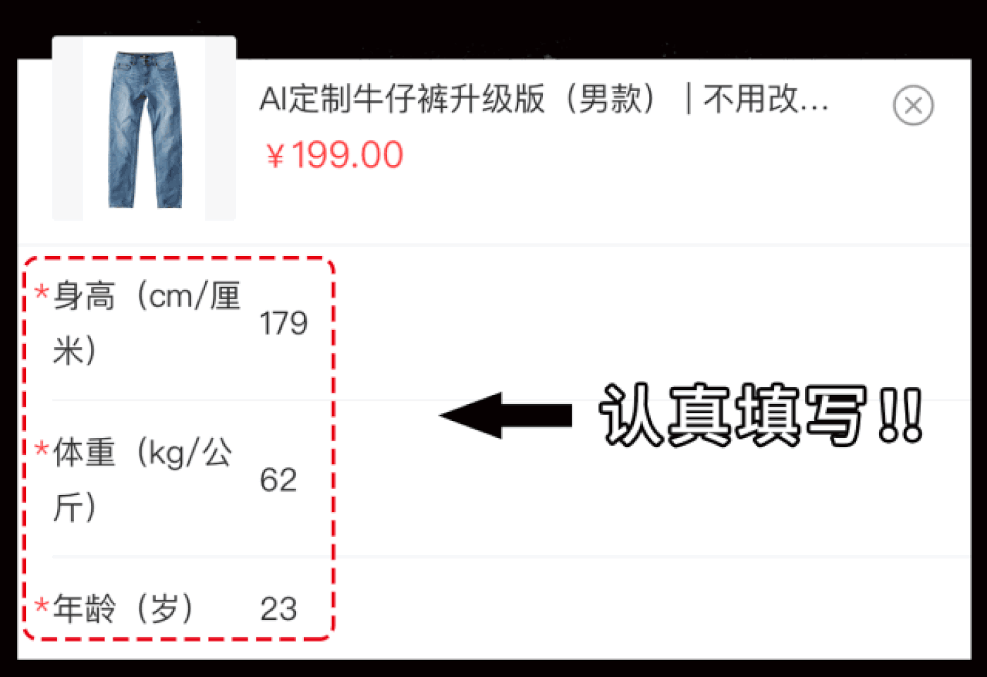 至于为什么要填写年龄。是因为人在每个年龄阶段的腰部弹性不一样,这也是定制牛仔裤腰部尺寸的重要参照数据,大家都放心填写吧,会给大家保密!