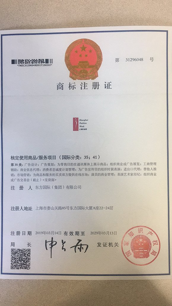 会上宣布,“上海时装周”已在今年3月13日正式获得国家市场监督管理总局商标局批准,成为国家注册商标。