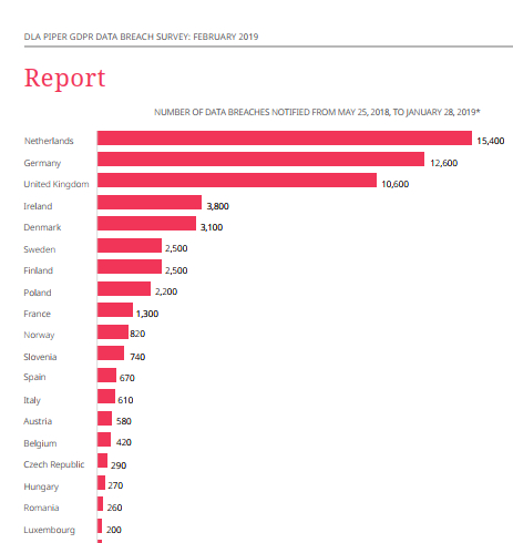 全球最大律所之一DLA Piper在2019年2月所做的调查显示,自GDPR生效以来,欧盟监管机构共收到5.9万起个人数据泄露事件的报告,共进行了91次处罚。其中荷兰、德国和英国收到的报告最多。DLA Piper合伙人麦基恩 (Ross McKean) 在报告中表示:“基于收入比例的罚款机制和美国式集体诉讼索赔让GDPR从根本上改变了各个机构在泄露个人数据时的合规风险。”