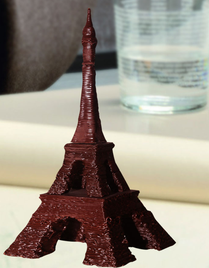 3D巧克力打印机目前是所有3D食物打印机中发展最为迅速的。比如,巧客生产的食品3D打印机能制作出法国巴黎铁塔型、兔子型等各种形状各异的巧克力。