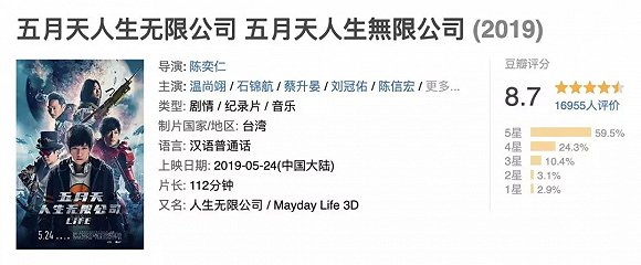 5月24日,作为中国台湾乐队“五月天”第三部演唱会电影《五月天人生无限公司》登陆内地院线。截至当前,上映5天该片累计票房已突破3500万元,猫眼评分9.1,预测票房4677万,豆瓣评分更是高达8.7分。