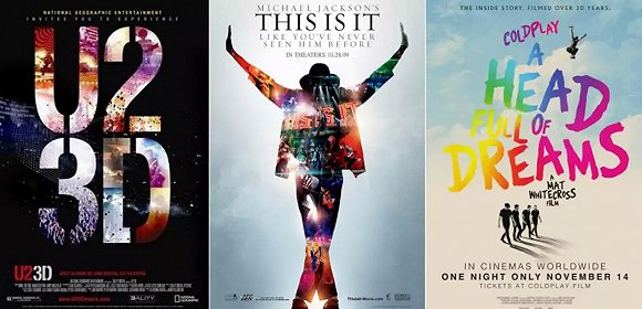 多年来,包括迈克尔·杰克逊、麦当娜、碧昂斯、凯蒂·派瑞、贾斯汀·比伯、麦莉·塞勒斯,以及滚石乐队、单向乐队、Coldplay 乐队、BIG BANG、防弹少年团等,越来越多的头部歌手及乐队开始拥有属于自己的演唱会电影。这些将演唱会搬上大银幕的音乐电影,也大多赚得盆满钵满。