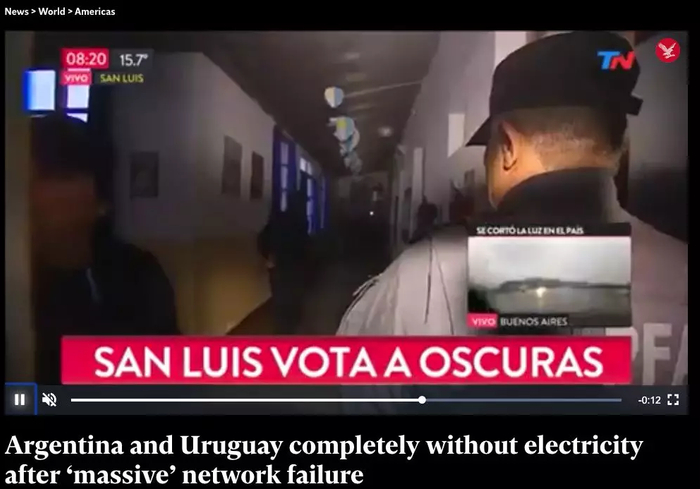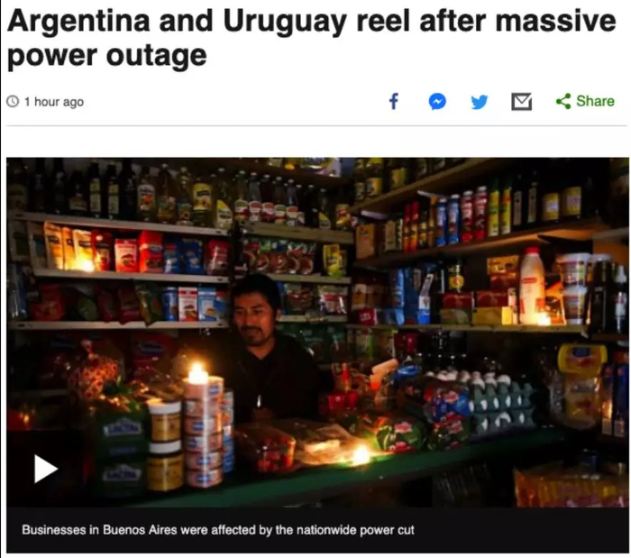 就在昨天,阿根廷人就经历了这样的事……这片278万平方公里的辽阔国土(面积约为日本的7倍),除了最靠近南极的那片“离岛”以外,竟然全境断电。不仅如此,周边邻居乌拉圭和巴拉圭也受到了影响。