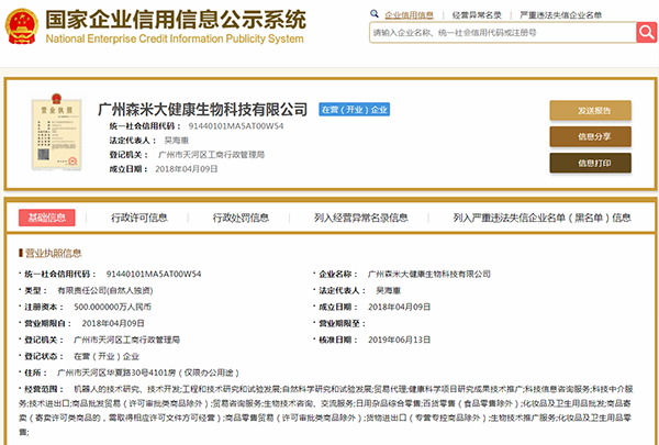 此外,“广州森米生物科技有限公司”还因“登记的住所或经营场所无法联系”,而两度被广州工商局天河分局列入“经营异常”名单,最近的一次为2019年1月。