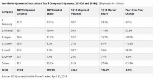 受到4G手机升级浪潮退去、性能提升带来的刚性换机需求走弱影响,国内手机市场出货量持续走低,中国信通院发布《2019年5月国内手机市场运行分析报告》显示,2019年前5月,国内手机市场总体出货量1.51亿部,同比下降4.1%。
