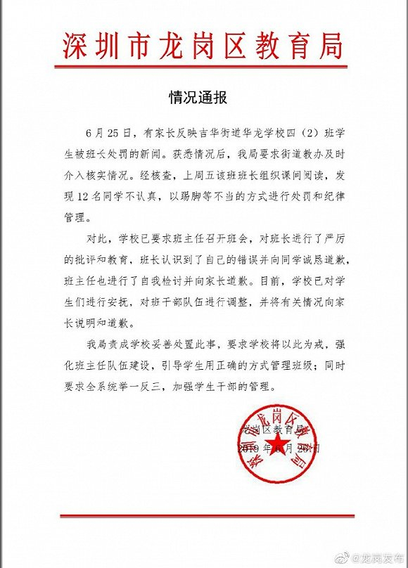 深圳市龙岗区教育局通报,6月25日,有家长反应吉华街道华龙学校四(2)班学生被班长处罚。获悉情况后,我局要求街道教办及时介入核实情况。经核查,上周五该班班长组织课间阅读,发现12名同学不认真,以踢脚等不当的方式进行处罚和纪律管理。