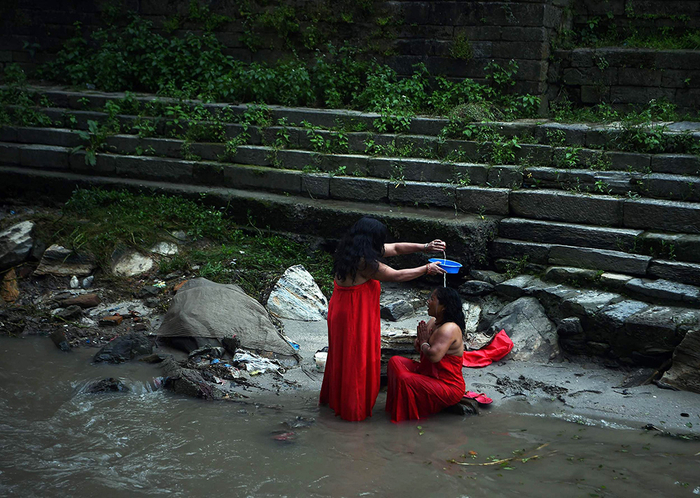 尼泊尔加德满都,印度教女信徒在巴格马蒂河中沐浴祈祷,庆祝潘恰米节(Rishi Panchami)。潘恰米节,又称为夫祈祷节,是提吉节的最后一天,在这一天妇女们要朝拜七位圣人,请求他们对她们在全年月经期间罪孽的原谅。印度教认为行经期是不纯净的,所以女人们在经期会被禁止参加一切宗教活动。
