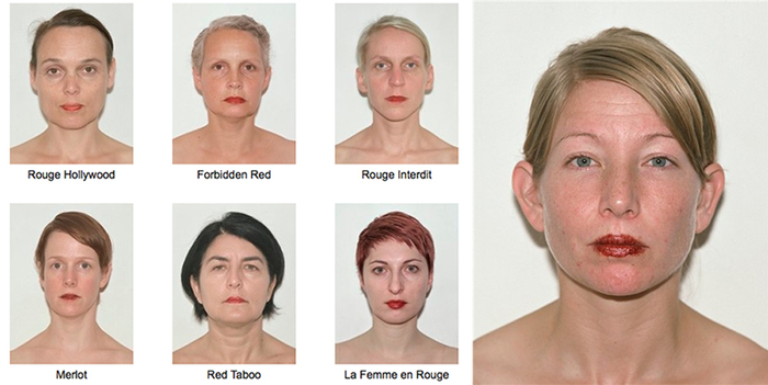 Ingrid Berthon Moine的《红色是那颜色》(Red Is the Colour)系列邀请女性不化妆出镜,只把自己的经血当做口红涂在嘴唇上(并附有像口红色号一样的名称)。作品中共有12名女性,像日历一样,代表了一年中12个月份。作品联结了月经禁忌与美容行业,同时,严格按照证件照标准拍摄的照片,也预示着像通行证一样通向女性成熟的、个人的、私密的旅程。