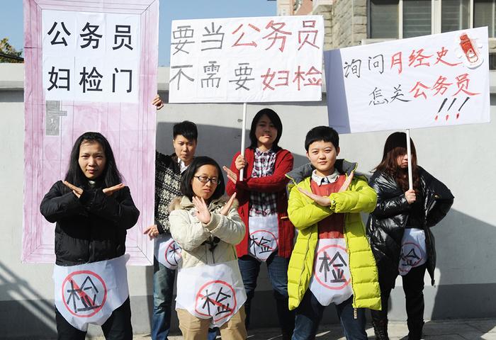 2012年11月26日上午11时,在武汉的湖北省劳动厅门口,大学生们表演“公务员考试男女平等,不做妇检”的行为艺术,抗议女大学生参加公务员考试体检被要求妇检。