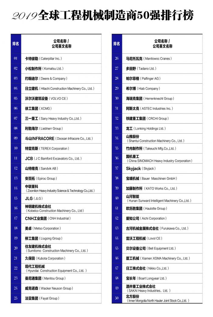 9月2-3日,在中国工程机械工业协会(CCMA)、设备制造商协会(AEM)、韩国建筑设备制造商协会(KOCEMA)主办的“2019年全球工程机械产业大会暨50强峰会”上,组委会发布了包括2019全球工程机械制造商50强/100强、2019中国工程机械产业影响力100人等在内的10余份榜单。