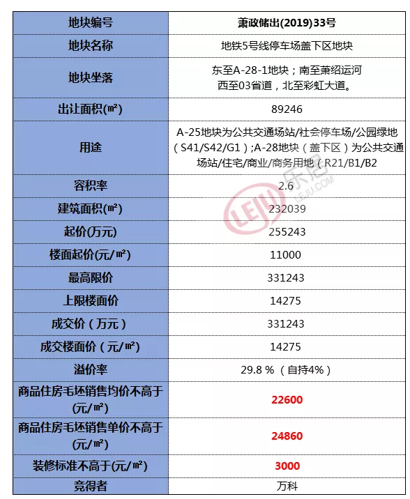 9月26日,萧山新塘板块迎来1宗土地出让,最终经过79轮竞拍,由万科以总价331243万元竞得,溢价率29.8%,自持4%,折合楼面价14275元/㎡。
