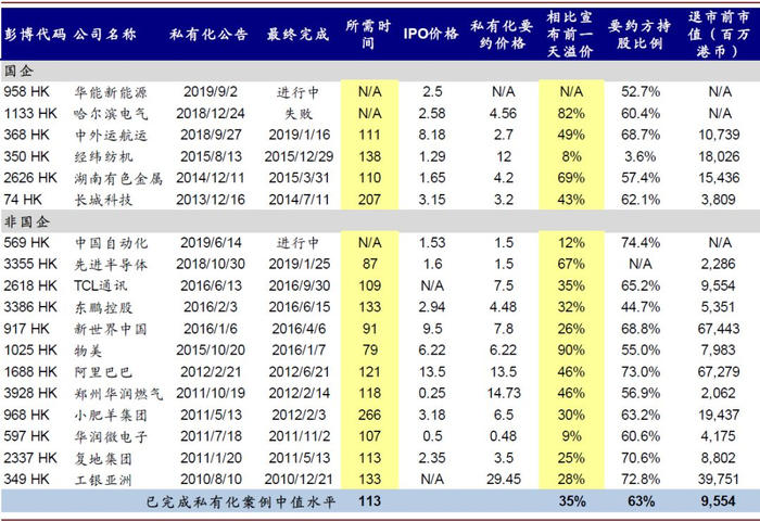2)所需时长:从私有化成功的案例来看,从公司开始宣布私有化要约公告、到最终完成私有化退市,所需时间在3~11个月间不等,平均用时113天左右;