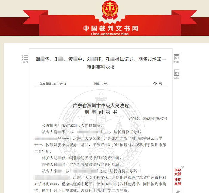 最终,谢某华由于在团队中起到主要作用系主犯,被判操纵证券市场罪,予以一年十个月的有期徒刑及100万元罚金。两名操盘手被判一年三个月,并处90万元、70万元罚金,其余两名助手均被判一年二个月,罚金30万元。