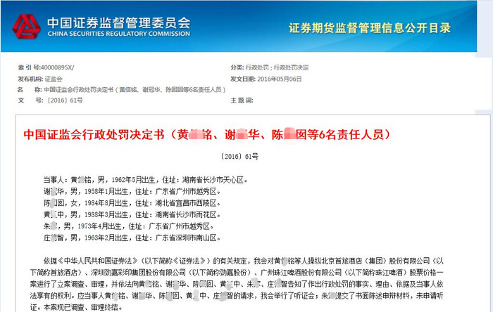 而在2016年5月,历经长期调查,关于黄某铭团队操纵市场的罚单终于落地,证监会最终认定,黄某铭等人操纵首旅酒店、劲嘉股份、珠江啤酒3只个股,合计违法所得达到3.25亿元。其中,黄某铭被责令依法处理非法持有的证券,并罚没6.49亿元;对团队成员谢某华、陈某囡、黄某中、朱某给予警告并分别处以90万元罚款。