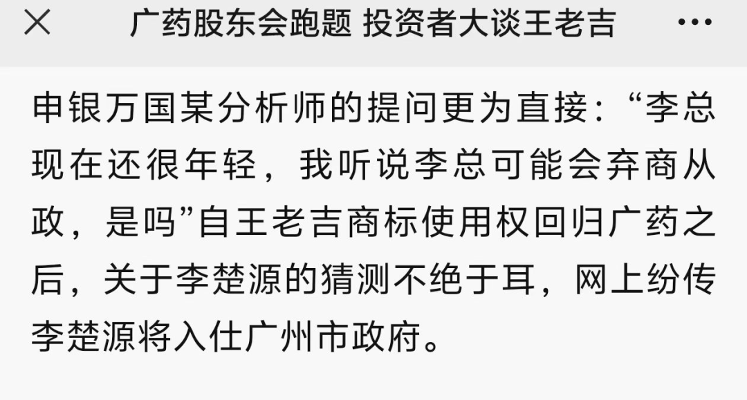 早在2012年,广药集团总经理李楚源就在股东大会上被问及“是否会弃商从政”这个问题。当时证券时报是这样报道的: