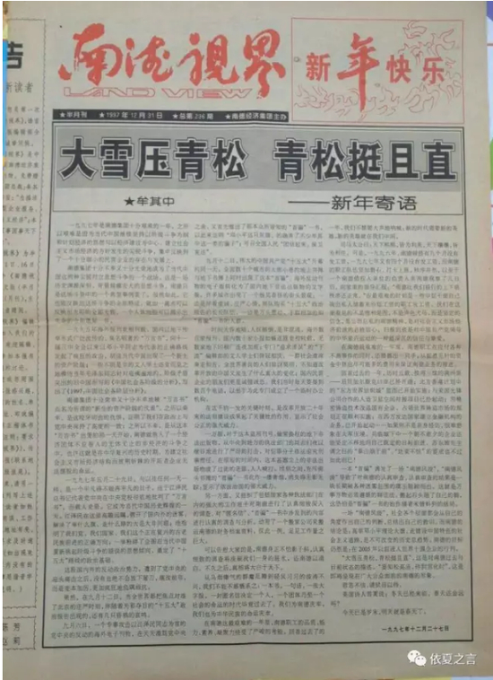 附:1998年元旦《南德视界》上的新年寄语:《大雪压青松 青松挺且直》