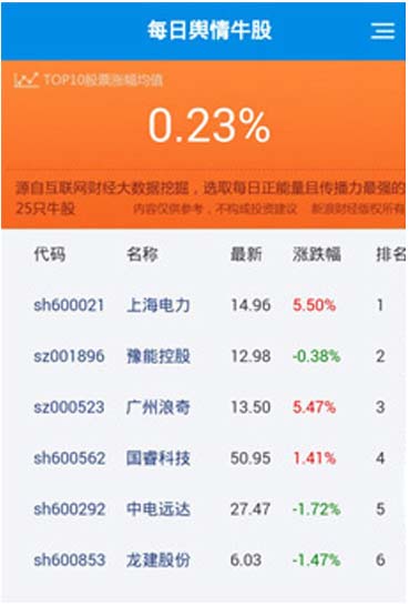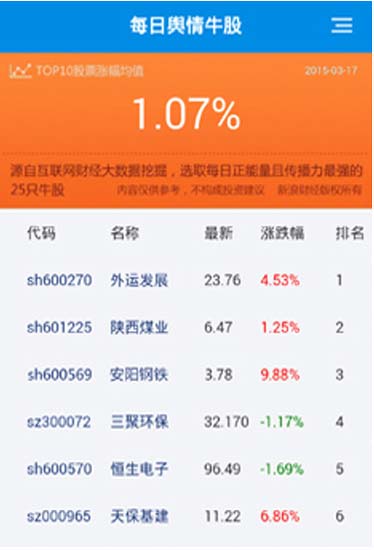 2015年3月18日,舆情牛股前十名平均涨跌幅达5.64%,同期上证综指涨幅2.13%。