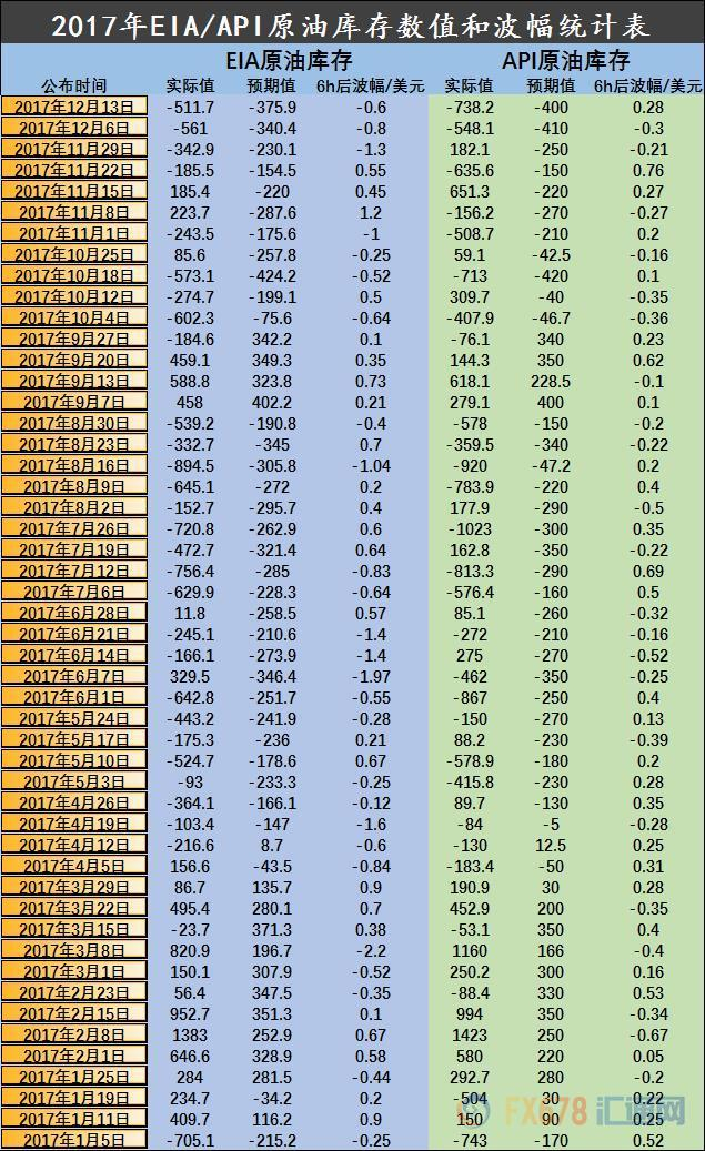 EIA和API原油库存数据向来是原油交易者密切关注的两项数据,但很多投资者对数据的解读都体现在表面,对交易起不到帮助。接下来,我们通过统计分析2017年全年这两项数据,竟然发现了一些投资者想象不到的规律,这对投资者的交易有重要的参考意义。虽然这些数据仅仅代表的是已经过去的2017年全年的数据,但历史往往是会重演,这些规律或许也适用于之后投资者对油价走势的预测。